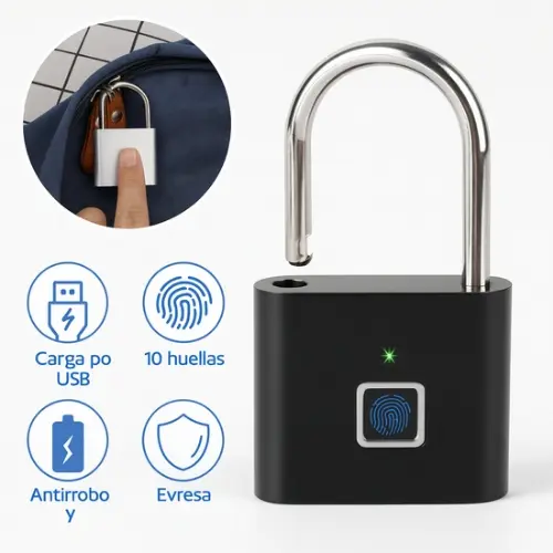 Este candado inteligente combina tecnología avanzada con diseño robusto, ofreciendo seguridad máxima y comodidad absoluta. Olvídate de llaves y códigos: solo tu huella digital desbloquea el candado, garantizando acceso rápido, seguro y confiable. Ideal para maletines, lockers, mochilas, equipaje y cualquier objeto que necesite protección.
