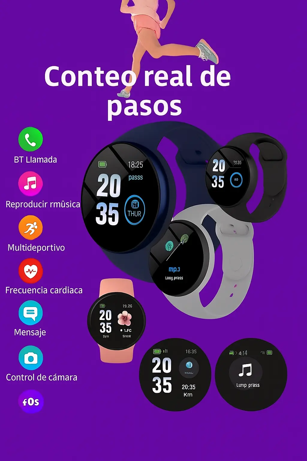 Smartwatch (Macaron Color) con pantalla redonda y pulsera de silicona. Funciones: monitor de pasos, calorías, distancia, frecuencia cardíaca, presión, sueño, notificaciones de llamadas y mensajes, alarma y recordatorio sedentario. Compatible con Android y iOS. Perfecto para quienes buscan diseño moderno y práctico a un precio accesible.