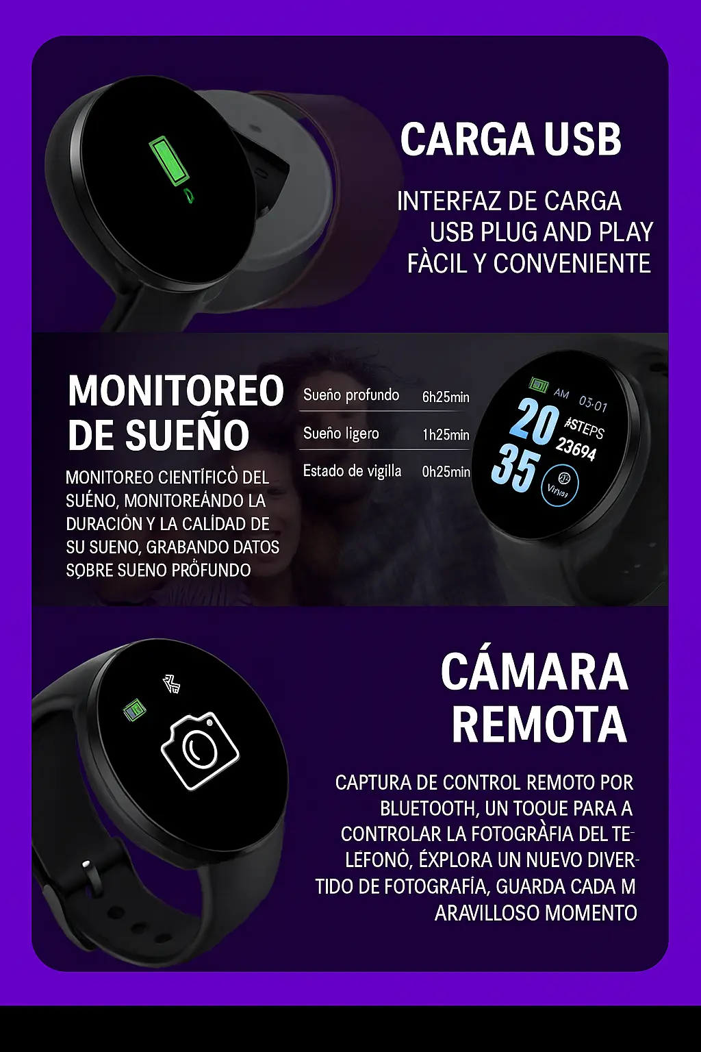 Monitoreo de frecuencia cardíaca, pasos, calorías y calidad del sueño para que cuides tu bienestar las 24 horas.